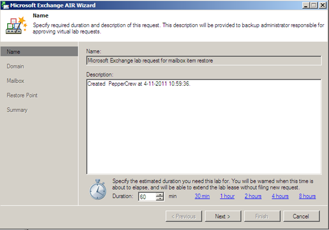 In this wizard section that will popup you can set the time limed you want to have to access the recovered environment. For recovering some mail box items of one user 30 minutes is more than enough.