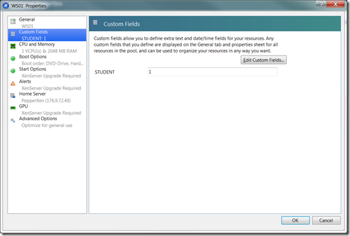 The custom field can be used to uniquely identify a virtual machine if the name of the machine is reused. In my environment I cloned the virtual machine ‘SERVER01’ multiple times and added a CustomField ‘STUDENT’. For each student a virtual machine is published.