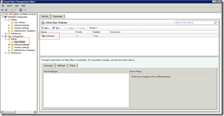 Multiple Citrix policy objects can reside in a Active Directory Group Policy Object. By default there are two 1) a Computer policy object named “Unfiltered” and 2) a User policy object named “Unfiltered”.