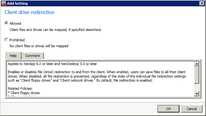 Boolean data types, like ClientDriveRedirection, are either Allowed or Prohibited. These settings are configured by setting the State object to Enabled or Disabled.
