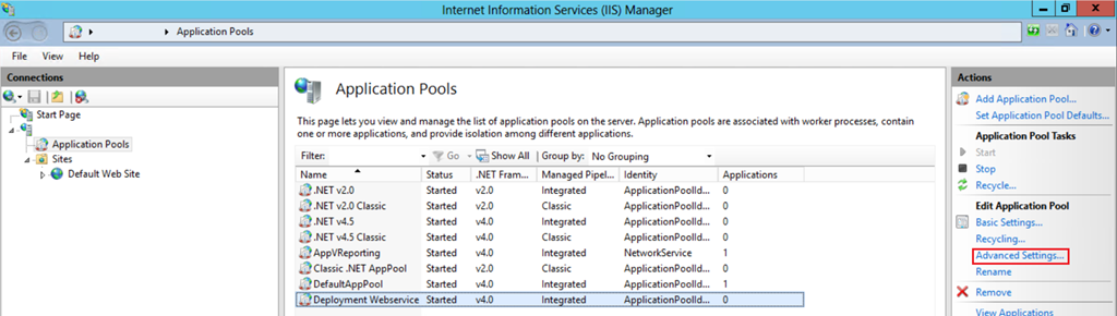 - Select the newly created application pool Deployment Webservice and click on Advanced Settings