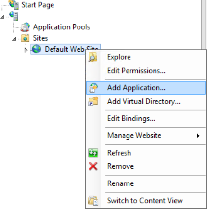 - In the Default Web Site (for example) click on Add Application