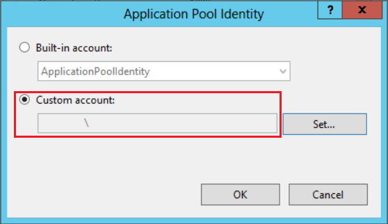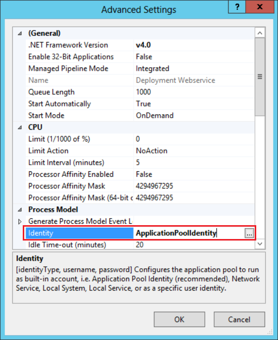 - In the advanced settings change the Identity from ApplicationPoolIdentity to an Active Directory account that has sufficient permissions to query the AD