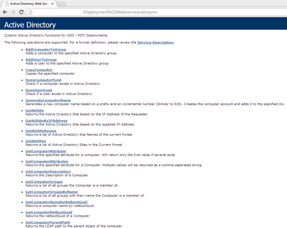 To verify if the web service is working you can open your browser and navigate to http://MDT.domain.local/Deployment WebService/ad.asmx. This should show you something similar to this: