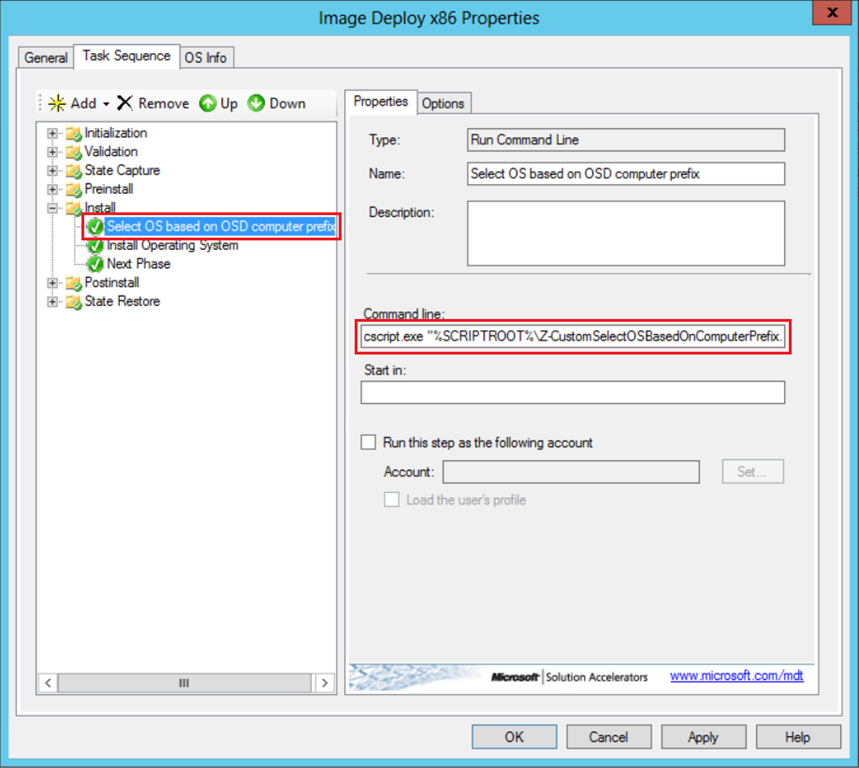 A customer has different client types and wants to use a single task sequence to deploy different images. For this purpose a custom task is added that selects an operating system based on the prefix of the provided computer’s name.