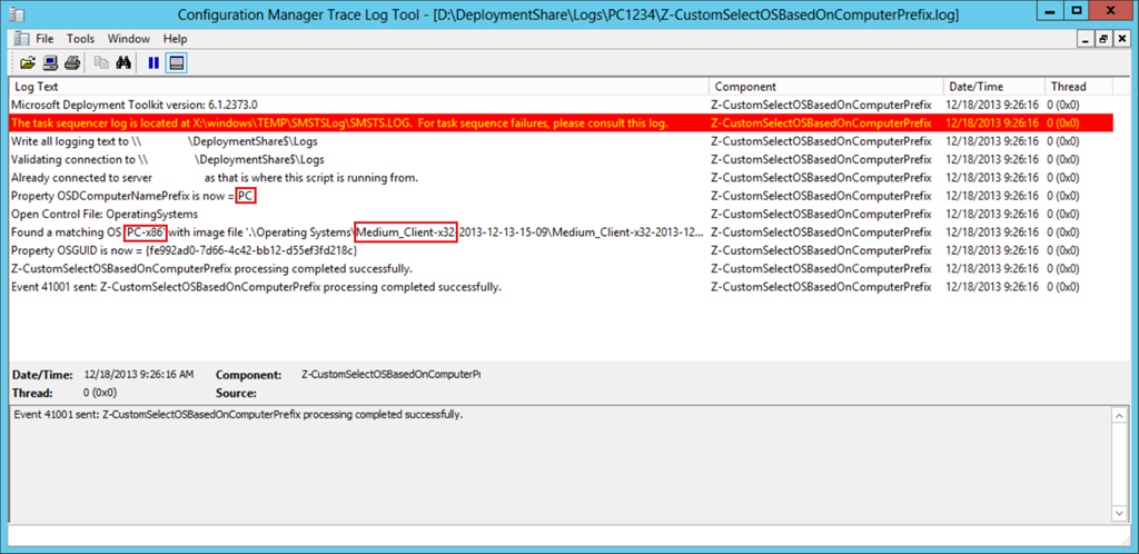 The script will log all output to Z-CustomSelectOSBasedOnComputerPrefix.log, (and BDD.log) this helps you troubleshoot the selection of an operating system.. ![]()