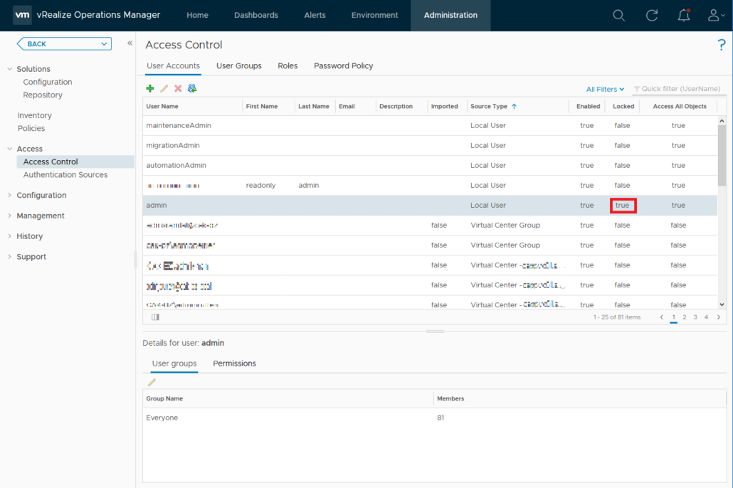 You can check if the admin account is lockout, by logging in to vROPS with your own account and go to Administration -> Access -> Access Control. There you’ll see all accounts and if they are locked.