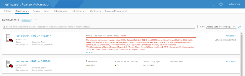 At the customer they use Vrealize Automation for the deployment and maintenance of the vm’s. So after making a new Linux template and a customization specification in vCenter, I added them to a valueset for the Linux blueprint in vRA and requested a new linux vm in vRA. The deployment started and in about 15 minutes the deployment of de new server was on 99% completion. Unfortunately the progressbar stayed at 99% for almost 2 hours only to fail miserably with the message: