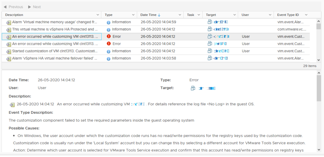 The errors stated: - “An error occurred while customizing VM <vm name>. For details reference the log file <No Log> in the guest OS.”