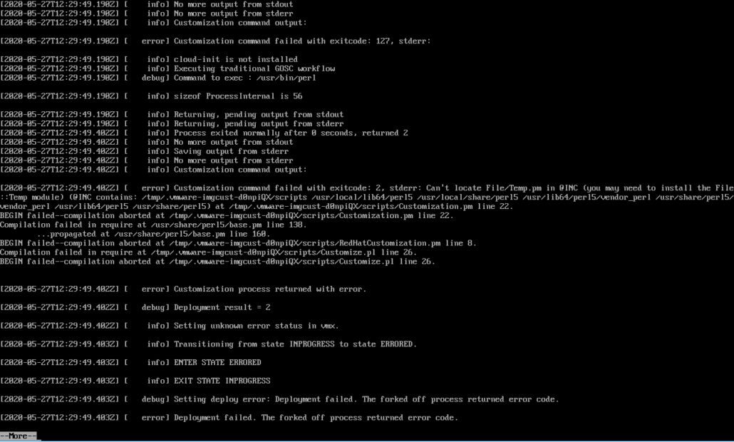 - “An error occurred while customizing VM <vm name>. For details reference the log file /var/log/vmware-imc/toolsDeployPkg.log in the guest OS.”