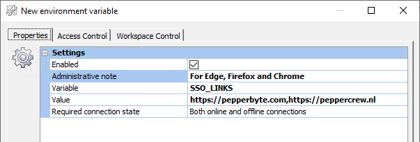 Fortunately for us, Ivanti Workspace has a thing called ‘Environment Variables’ in which you store values so you can use simply use the shortened variable. This means maintaining only one string of URLs to support SSO instead of now six. Here we create a new one, SSO_LINKS, with the supported websites comma separated.