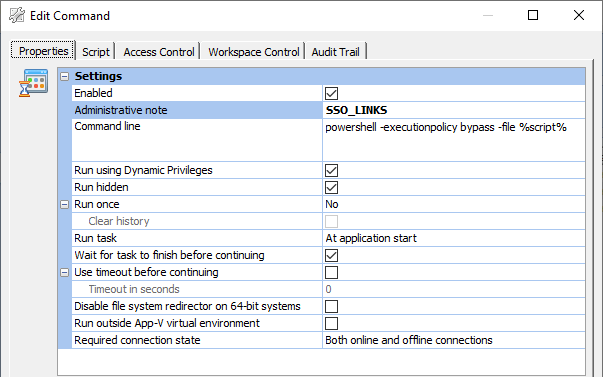 Firefox does things differently. Mozilla has a policy for NTML Delegation but as you can see, it requires one URL per line. This means inside the Ivanti Workspace Console you can’t use the SSO_LINKS variable as this is just a string with multiple URLs connected. There is an easy solution to this problem. PowerShell and the option to execute commands when starting an application in Ivanti Workspace.