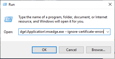 Now open a run box or a command prompt and enter the path + the executable + –ignore-certificate-errors, like so:C:\Program Files (x86)\Microsoft\Edge\Application\msedge.exe --ignore-certificate-errors