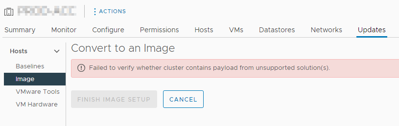 So, what was the problem here? In the past the company started with the segmentation of their network. And in preparation for this the hosts were configured with 2 management adapters, one in the old subnet and one in the new subnet. Apparently, this doesn’t work well with the check for the cluster eligibility to be managed with a single image. After removing the extra management VMKernels – so every ESXi host had just one management adapter – the check completed successfully and the new image updating could be used.